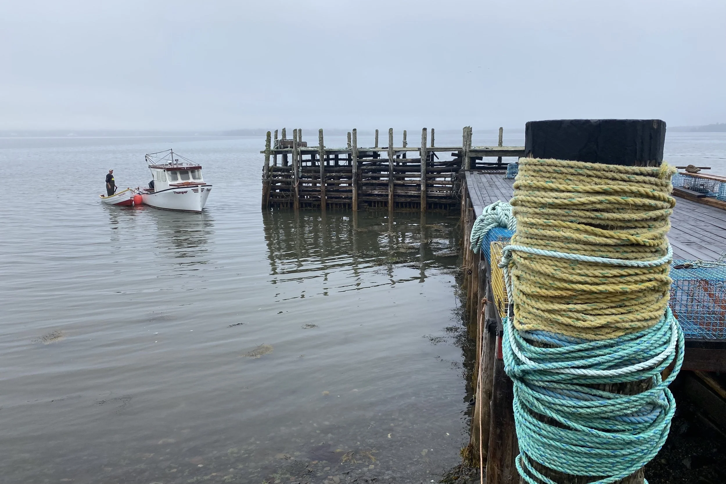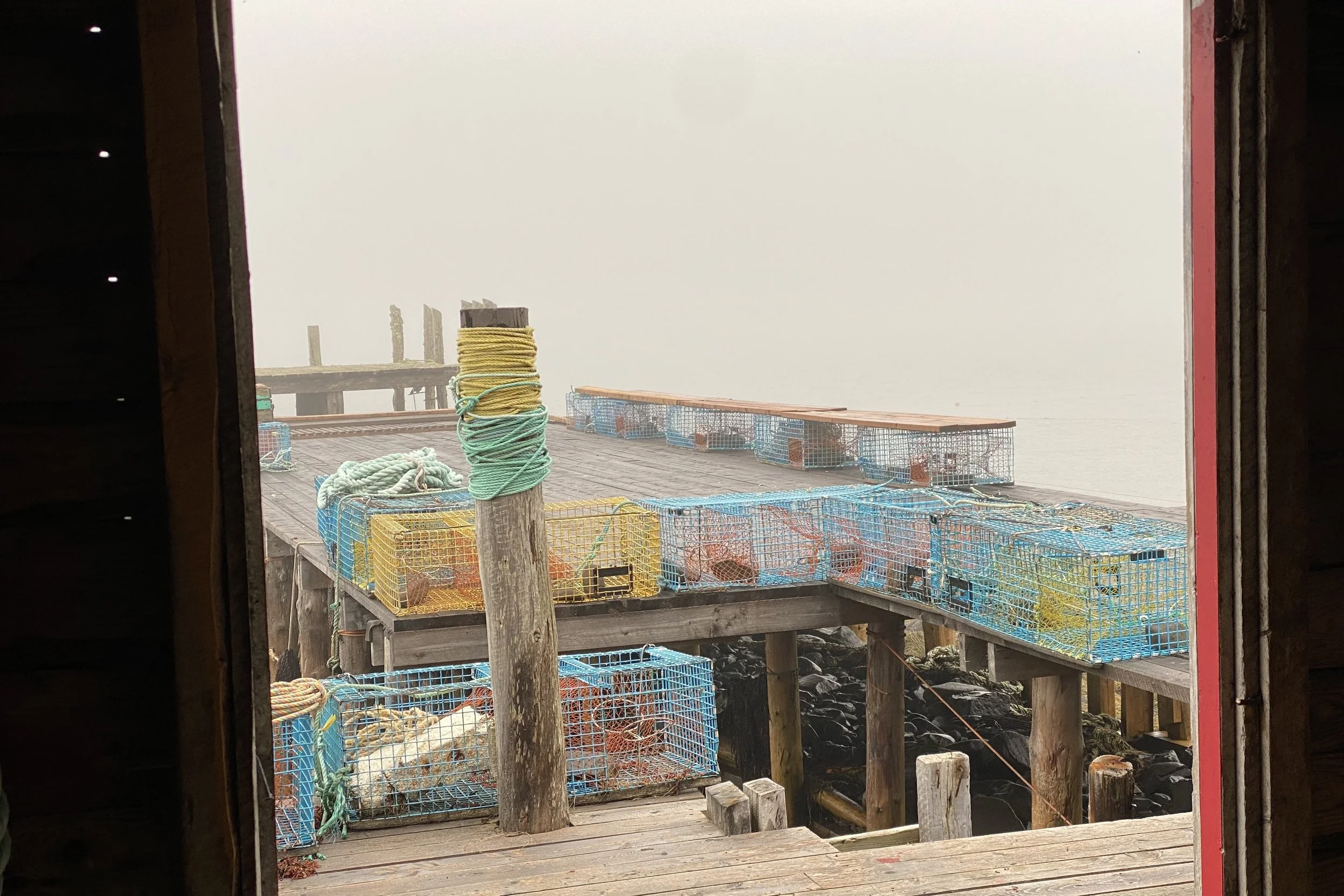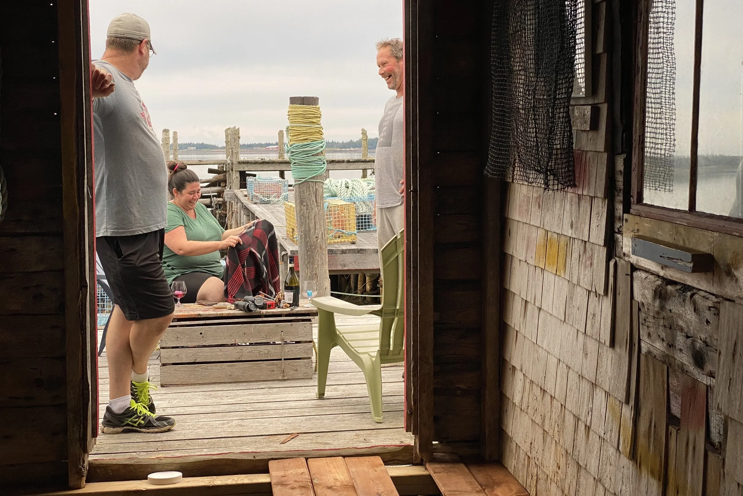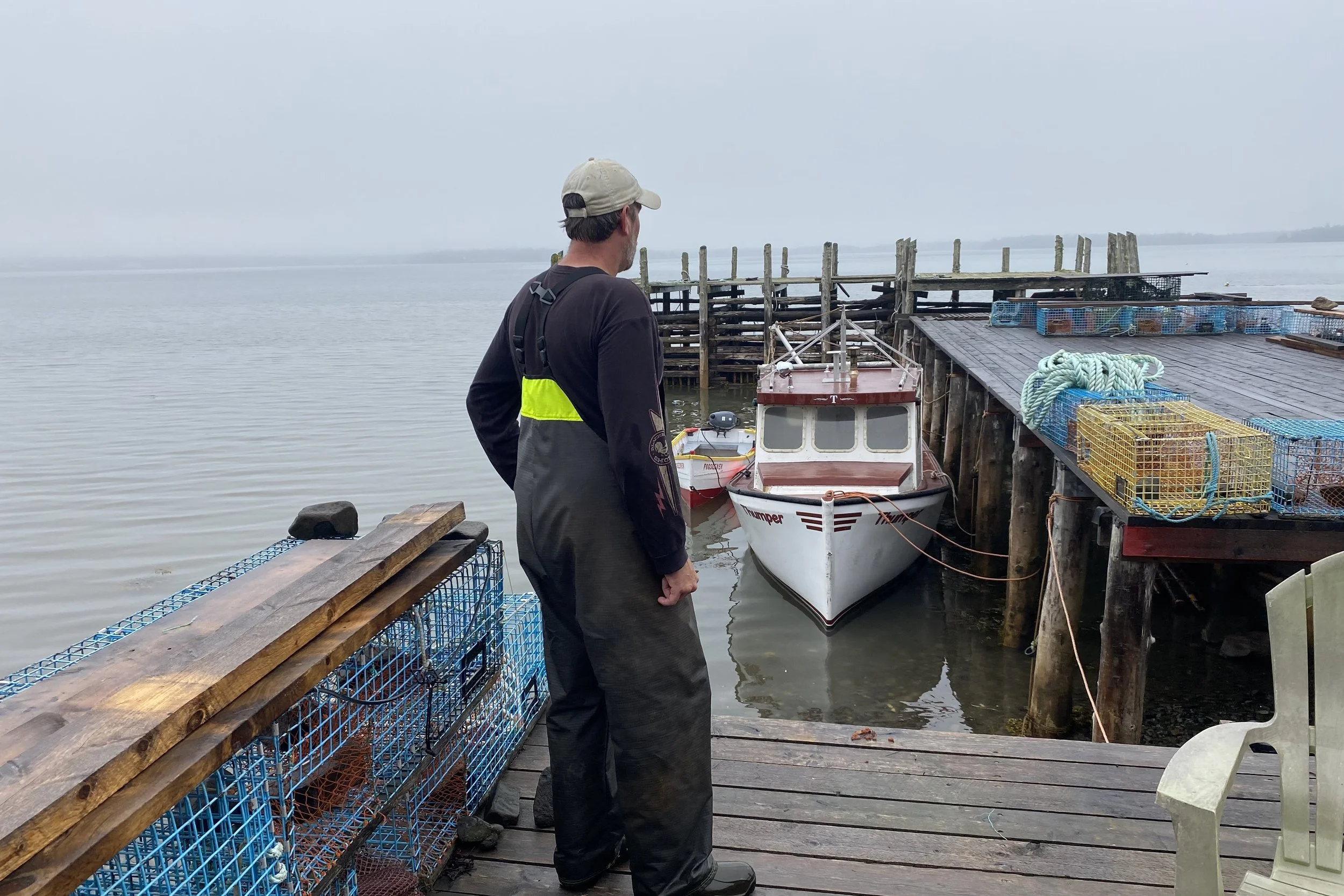 Examining the fine points of rigging traps with Lee and Carter on Brian Ingall's; wharf